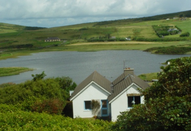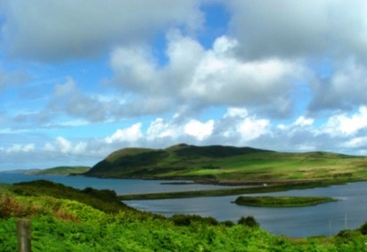 View over Lough Annillaun and its island, Cleggan Beach, Cleggan Bay with its abundance of wild mussels 'Carraig a Duilicin', 'Mussel Rock' Perri winkles, Razorfish and other species. Cleggan Hill dominates Cleggan Bay from the north .