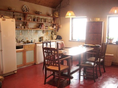 Cottage type kitchen with Aga cooker, fitted sink unit with washing machine and dryer under worktop and other free standing furniture, Painted concrete floors.