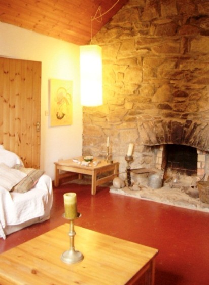 Great natural stone open fireplace features in this room. Floor to ceiling stone wall, timber ceiling and doors, painted concrete floor.