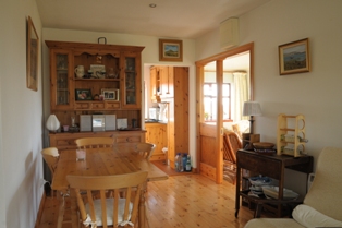 Turning right leads one into the Living/Dining area. This a very nice presented room with ample natural light from a corner window that has a west/north west aspect and also light filters through from the Sun Lounge. There is a solid fuel stove in situ set on a stone hearth with brick surround and timber mantle over. Wood features in both the floor and ceiling. Spot lights in ceiling.
