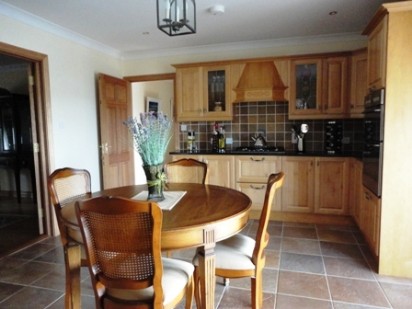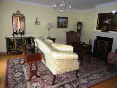 Turning left on entering Reception Hallway, one encounters this spacious room with features that include; hardwood flooring, open fire with polished stone hearth and surround. Full view of the property entrance from this room with Kilkerrin hill in the background.