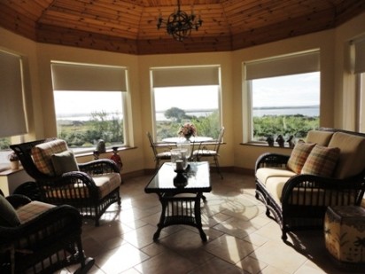 Average size 15.5ft X 14.2ft.Beautiful room which is south facing and its design affords natural light to filter through throughout the day. Its raised timber dome like ceiling and circular shape generates a great feeling of space and of course the views are superb. Overlooks Kilkerrin Bay and beyond to Bealadangan, Casla and Rosmuc together with the islands of Oilean Mor, Inish Treabhar and Lettermore.